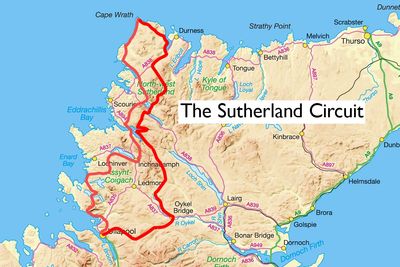 With this route it is possible to make a Sutherland Circuit, that starts and ends in Ullapool. This rivals the Skye trail in its beauty but is more wild, rugged and sustained. It is a complete loop with no repeat ways. It goes east from Cape Wrath walking through the Foinaven range to rejoin the Cape Wrath trail passing behind Ben More Assynt to Oykel Bridge and returns to Ullapool through a series of picturesque Scottish glens. It is sublime walking both grand and beautiful, and takes in coastal paths, traverses high cliffs, over spectacular mountains and across beautiful beaches. Days 23 to 35